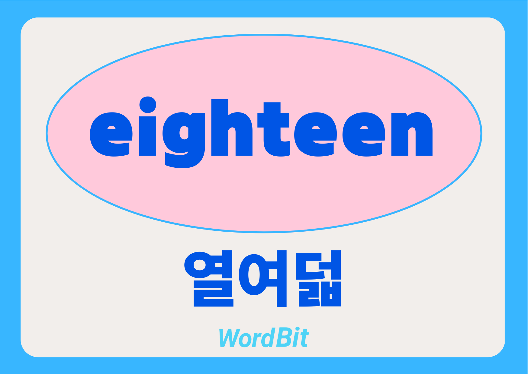 안녕하세요, 무료 잠금화면 영어공부 앱 워드빗입니다. 😊 영어 단어 eighteen의 뜻과 예문, 용법에 대해 설명드리겠습니다. 📘 eighteen [ˌeɪˈtiːn] ✅ 뜻 1. 열여덟 (숫자) – 17